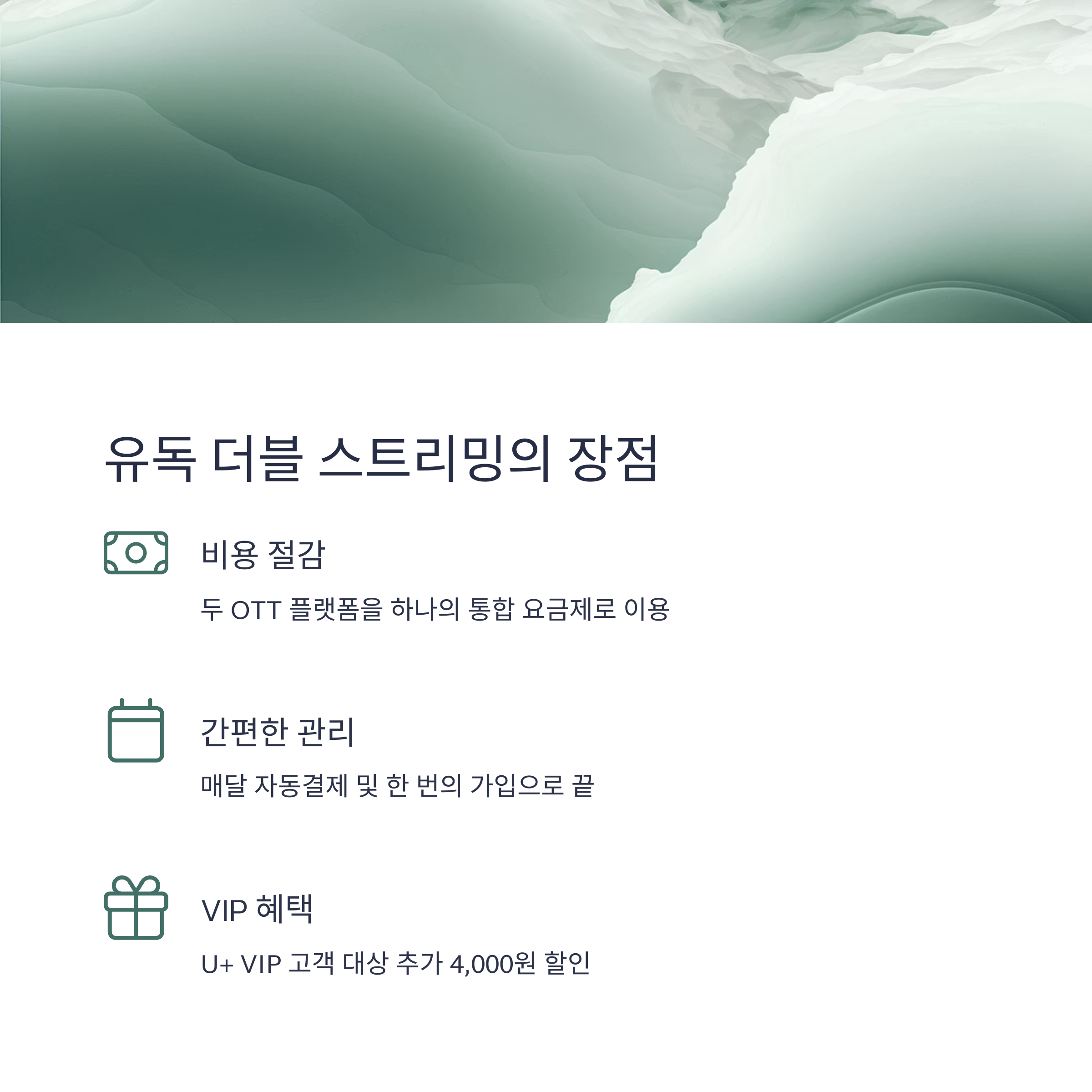 넷플릭스와 유튜브 프리미엄을 보다 저렴하게, 보다 간편하게 즐기고 싶다면 유플러스의 유독 더블 스트리밍은 더할 나위 없는 선택입니다. 한 번의 가입으로 두 OTT를 통합하고, 매달 자동결제로 더 이상 신경 쓸 일도 없습니다. 지금 바로 할인 혜택을 확인하고, 더블 스트리밍을 시작해보세요!