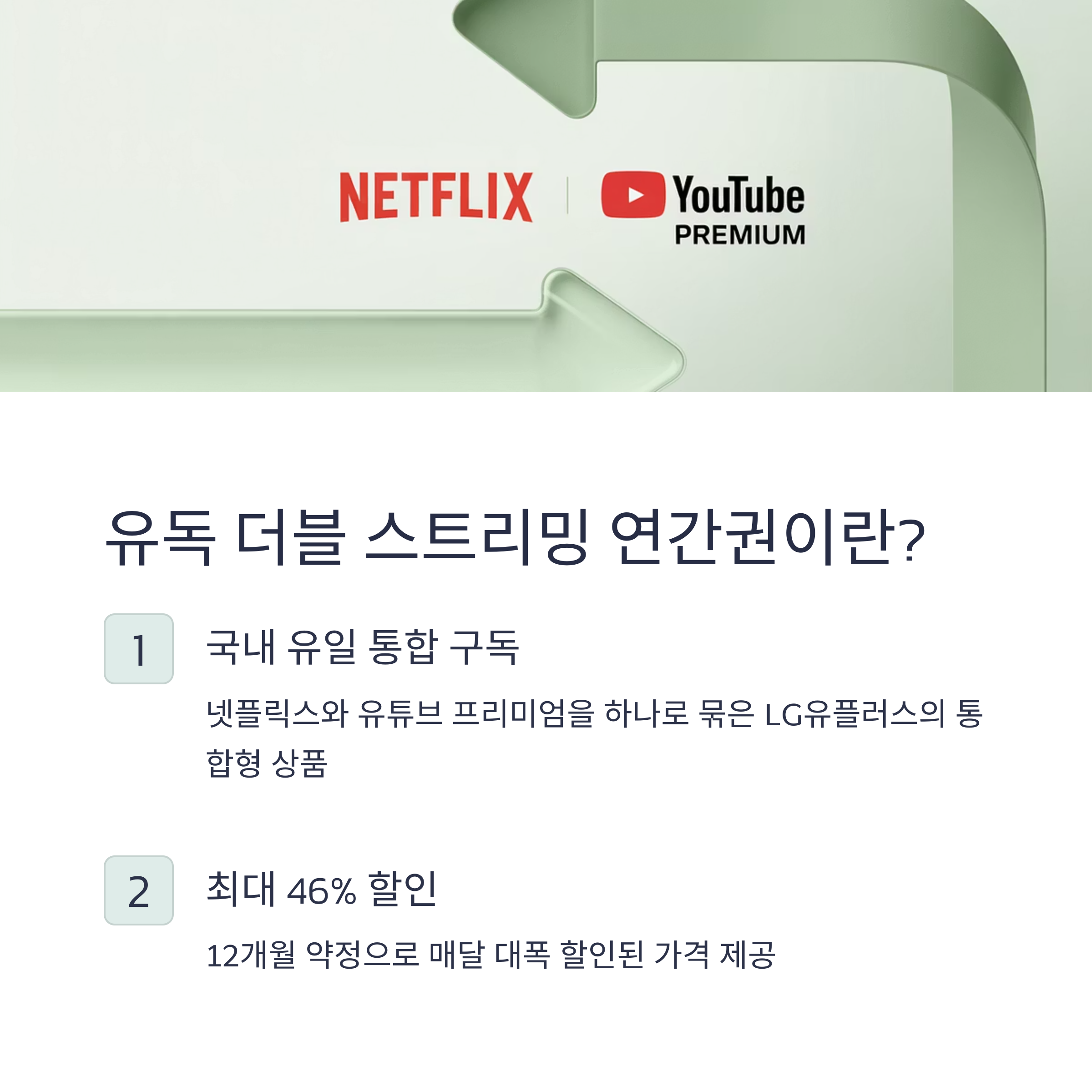 LG유플러스 ‘유독’에서 제공하는 더블 스트리밍 연간권은 넷플릭스 + 유튜브 프리미엄을 한 번에 구독할 수 있는 통합형 상품입니다. 12개월 약정 조건으로 매달 최대 46%까지 할인된 가격으로 이용 가능하며, VIP 고객이라면 추가 할인도 적용됩니다.