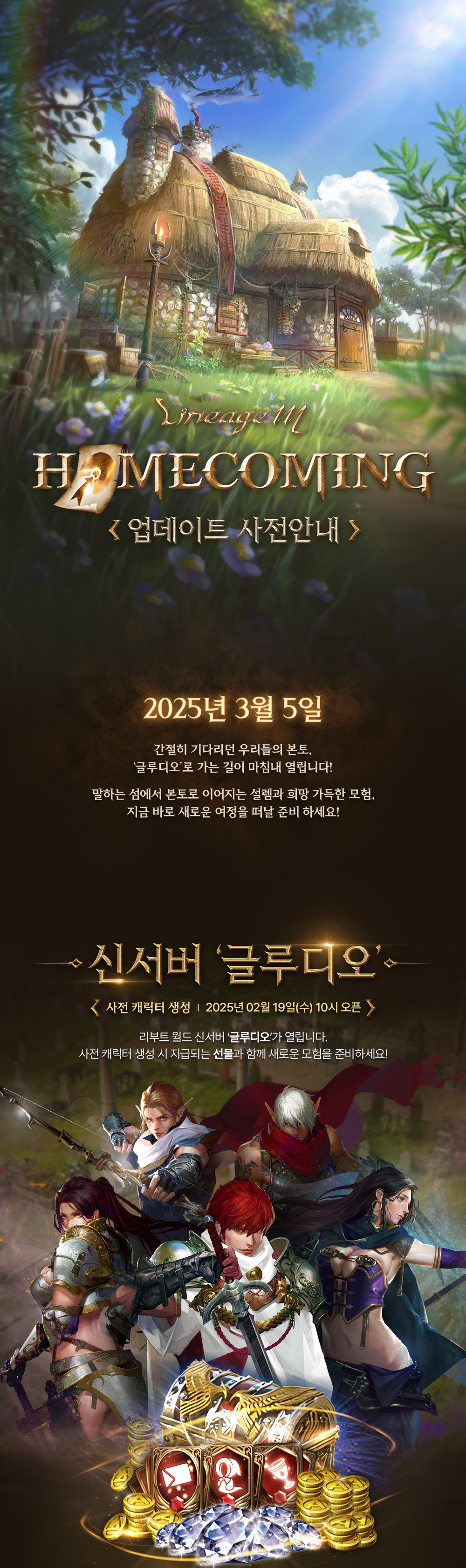 HOMECOMING 업데이트는 2025년 3월 5일에 진행되며, 이와 관련된 다양한 이벤트와 내용이 포함되어 있어요. 특히 업데이트 전, 2025년 2월 19일에 신규 서버 '글루디오'가 오픈할 예정이라 많은 유저들이 이 시점을 주목하고 있어요. 이 서버에서는 더욱 특별한 혜택과 경험을 제공할 계획이라고 하니 놓치지 말아야 해요!