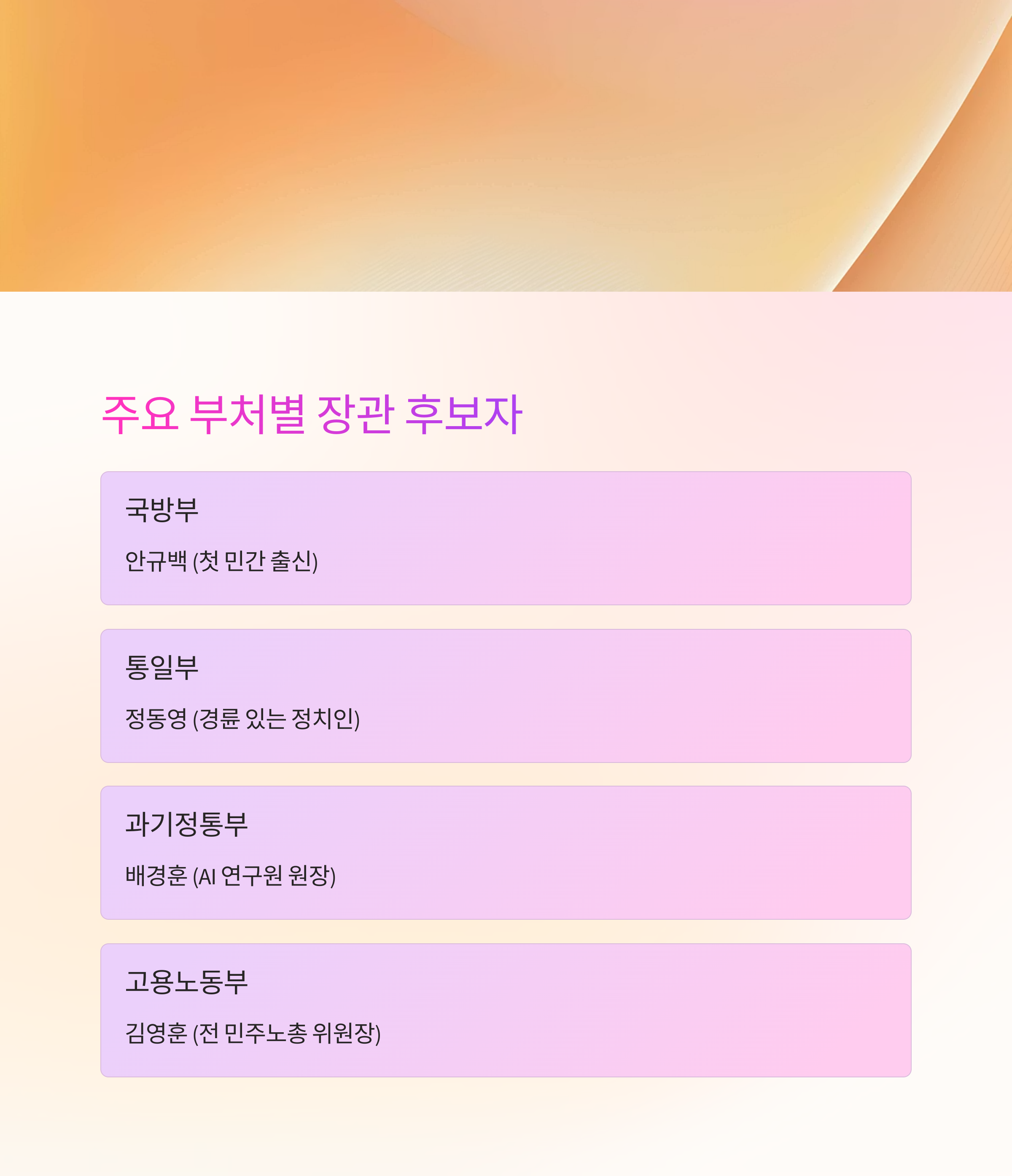 | 부처 | 장관 후보자 | 특징 |