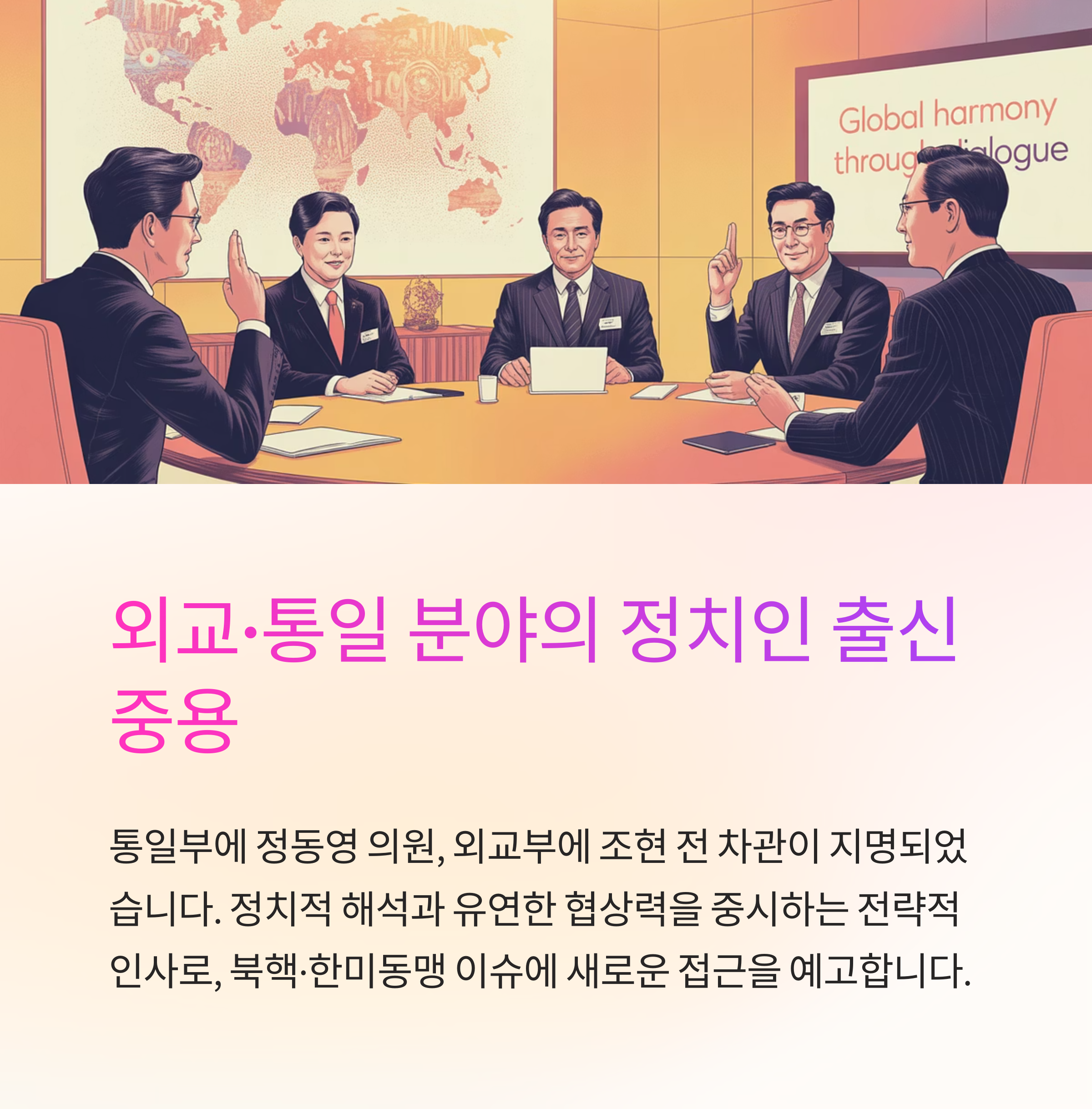 정치권에서 오랜 경력을 쌓은 인사들을 외교·안보 라인에 배치한 것은 한반도 정세에 있어 정치적 해석과 조율 능력을 중시하겠다는 뜻으로 해석됩니다.