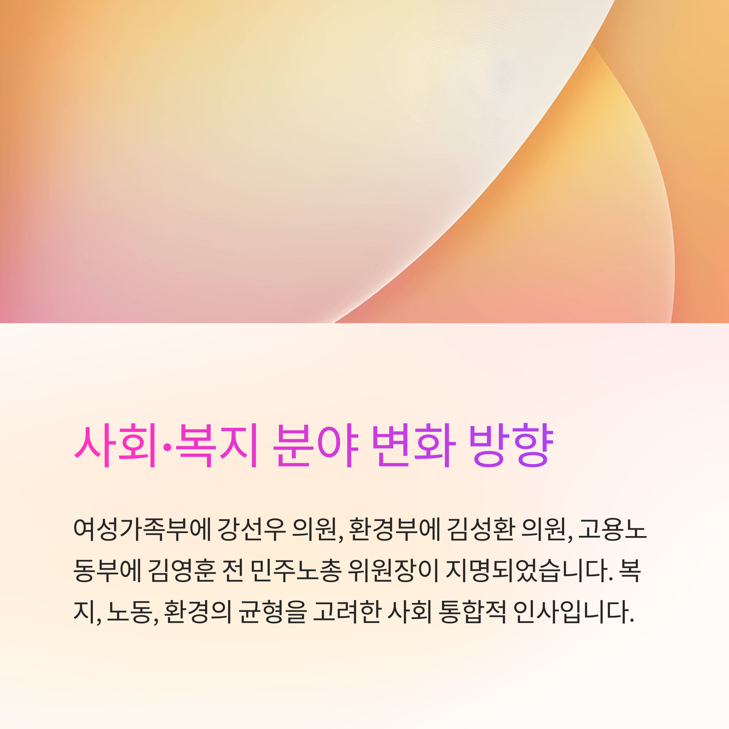 복지와 노동, 환경의 균형을 고려한 인사로, 사회 통합적 관점이 반영됐다는 평가입니다.