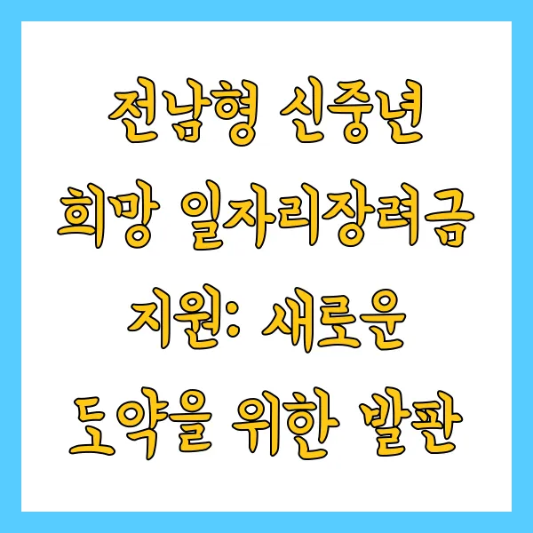 이처럼 다각적인 지원을 통해, 전남형 신중년 희망 일자리장려금은 신중년의 성공적인 재도약을 위한 든든한 발판이 될 것입니다. 지금 바로 용기를 내어 도전해 보세요!