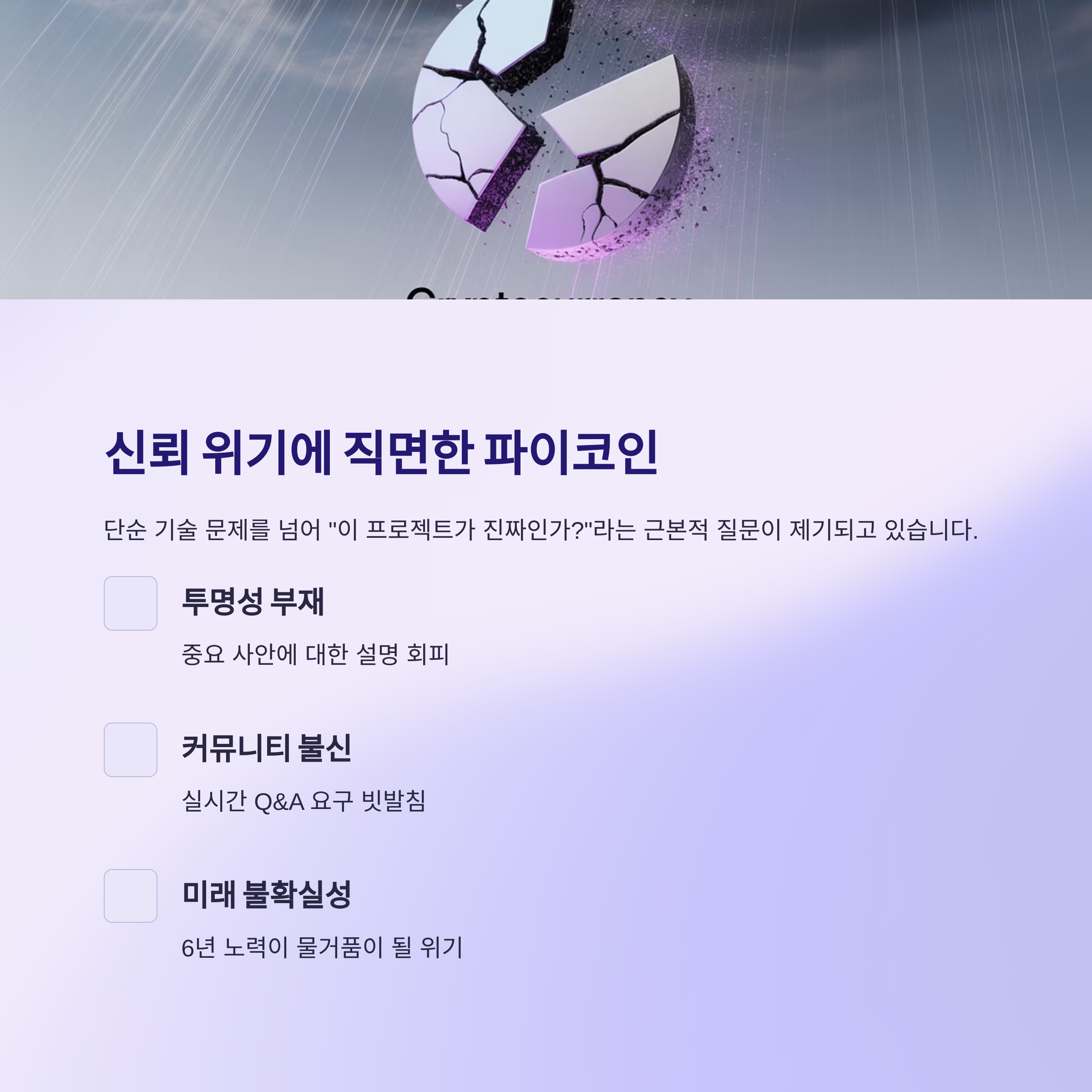 지금 파이코인 프로젝트는 중대한 신뢰 위기에 직면했습니다. 단순 기술 문제가 아니라 “이 프로젝트가 진짜인가?”라는 근본적 질문이 제기되고 있죠. 투자자이든 채굴자이든, 지금은 정보에 깨어 있어야 할 때입니다.